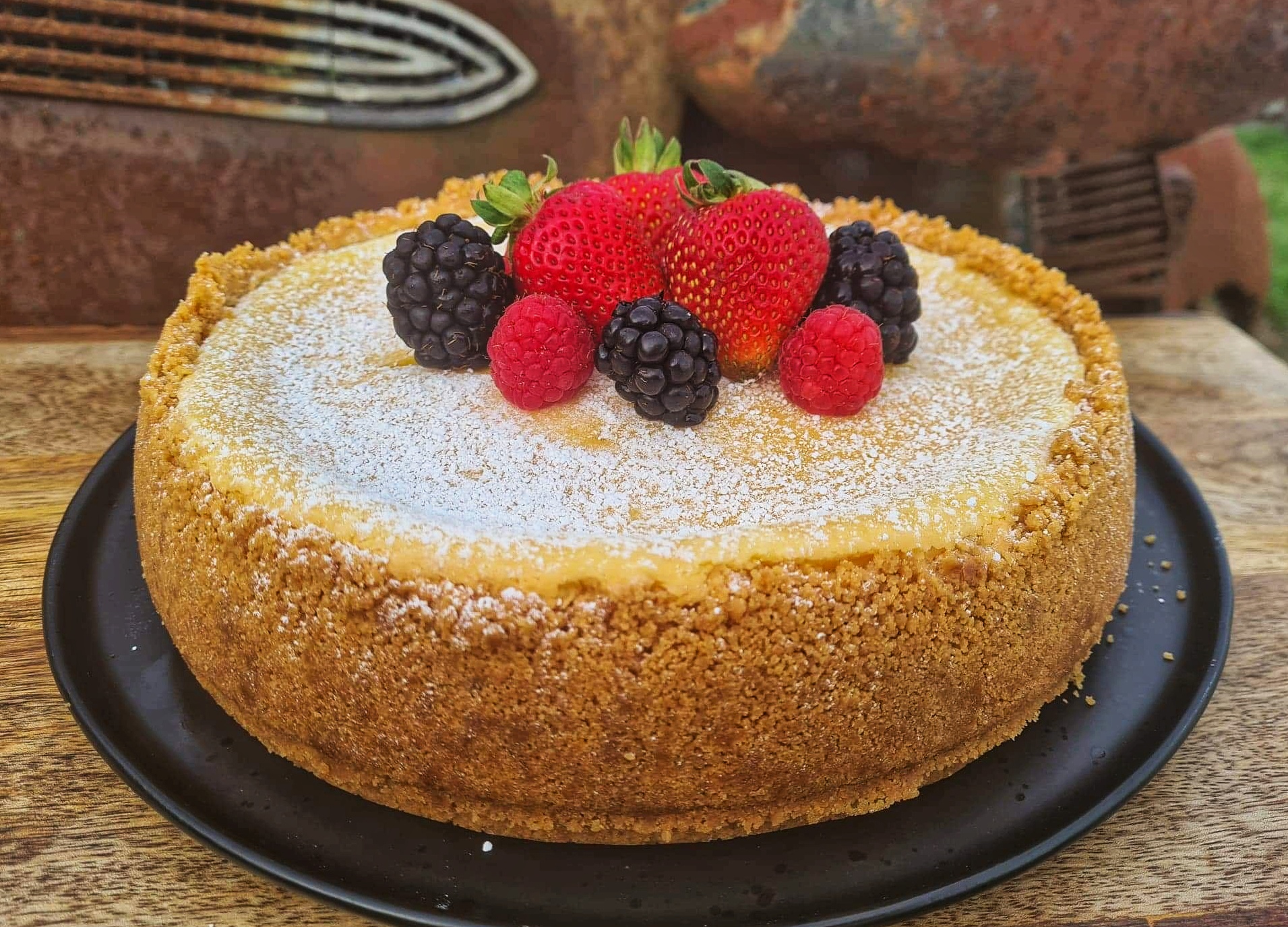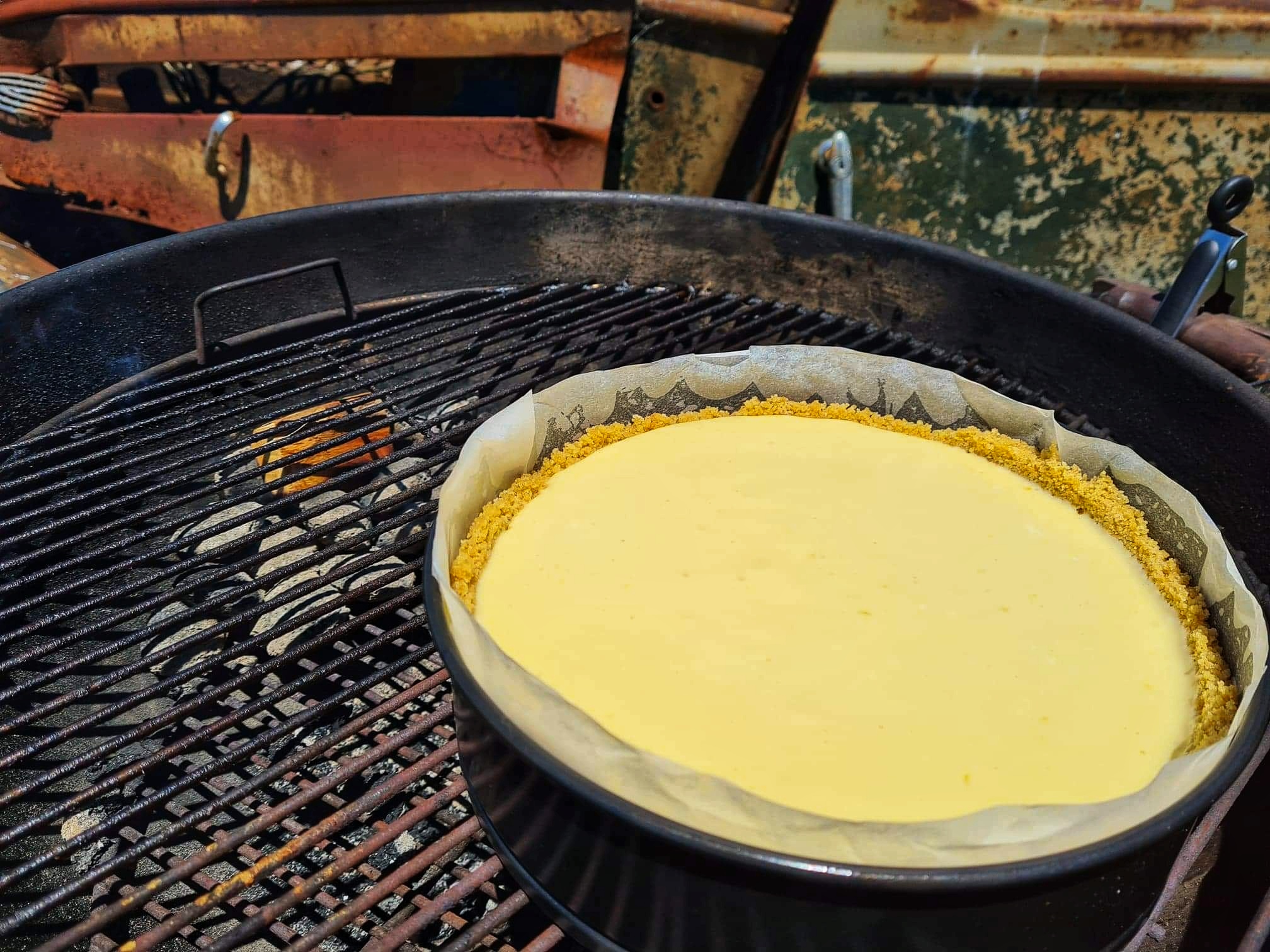 To avoid cracking during the cooling process, pre-heat your oven to 100C and place the cheesecake inside and turn the oven off with the door open slightly to cool, alternatively you can also cool in the Weber with a few heat beads, although the oven will be far more predictable.